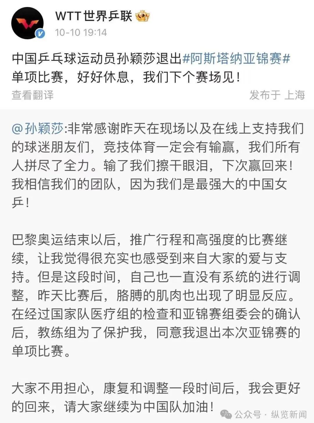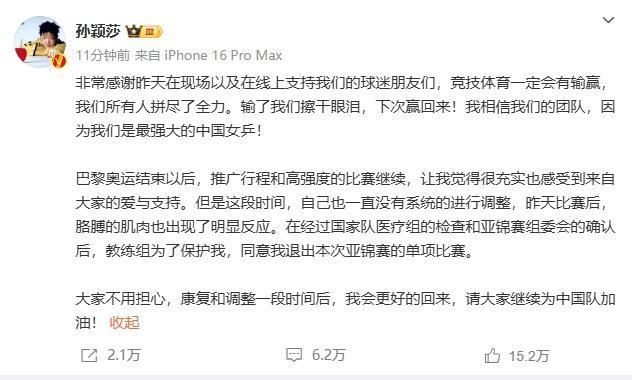 孙颖莎发文称